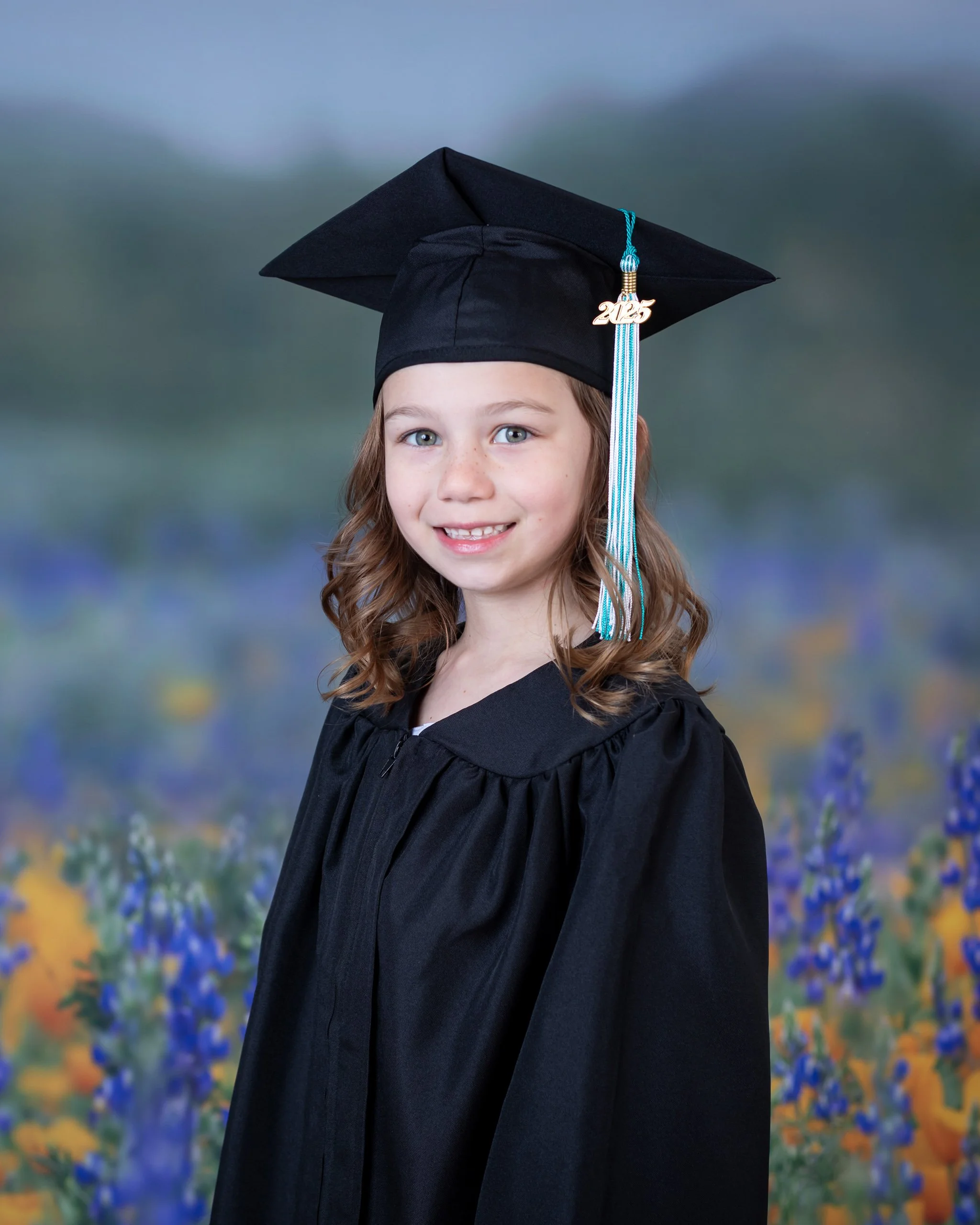 Kindergarten size and high school size caps, gowns, and tassels will be available to borrow for additional poses and photos. Feel free to bring your own graduation set if you would like.