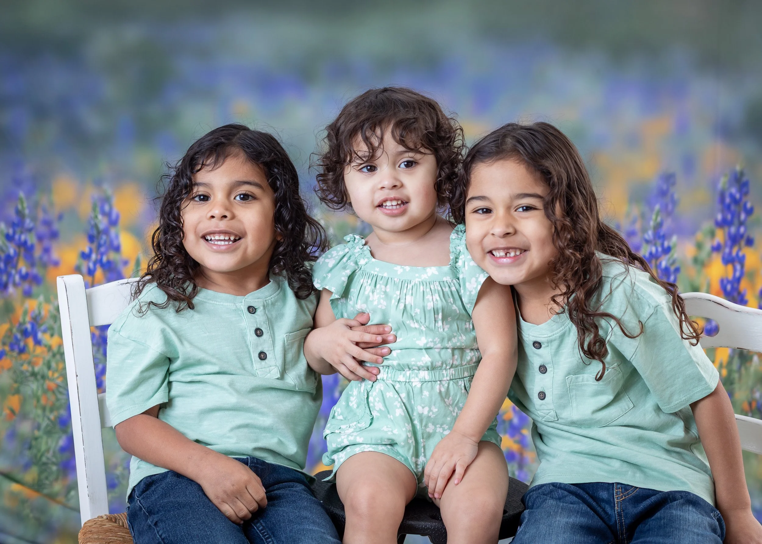 All photos will be taken in front of a spring backdrop with flowers. The main colors are green and blue with yellow, pink, and white flowers with a green hazy mountain background.